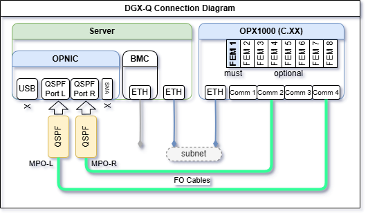 The DGX-Q system requires an Ethernet connection between the OPX1000 chassis and the server and an optical connection between the OPNIC and the OPX1000 chassis. Please follow these guidelines:
