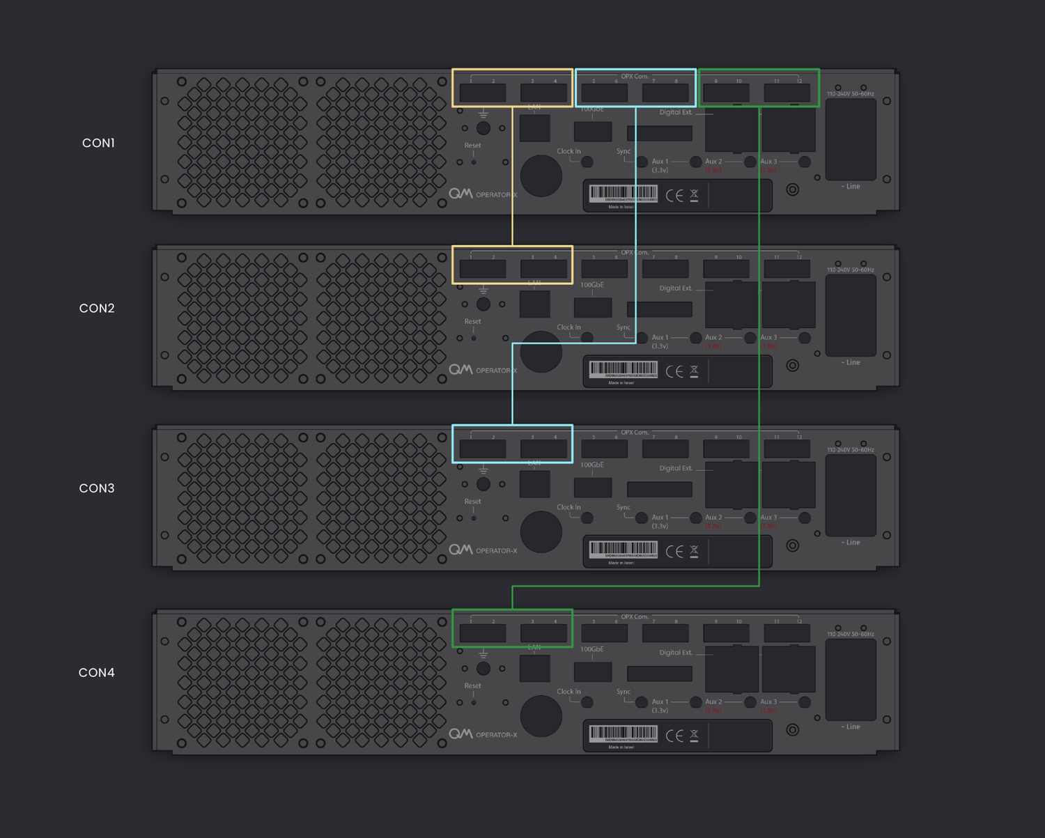The multi OPX+ system has four required connectivity groups. Clock & sync, Inter-controller communication, Network, and Power