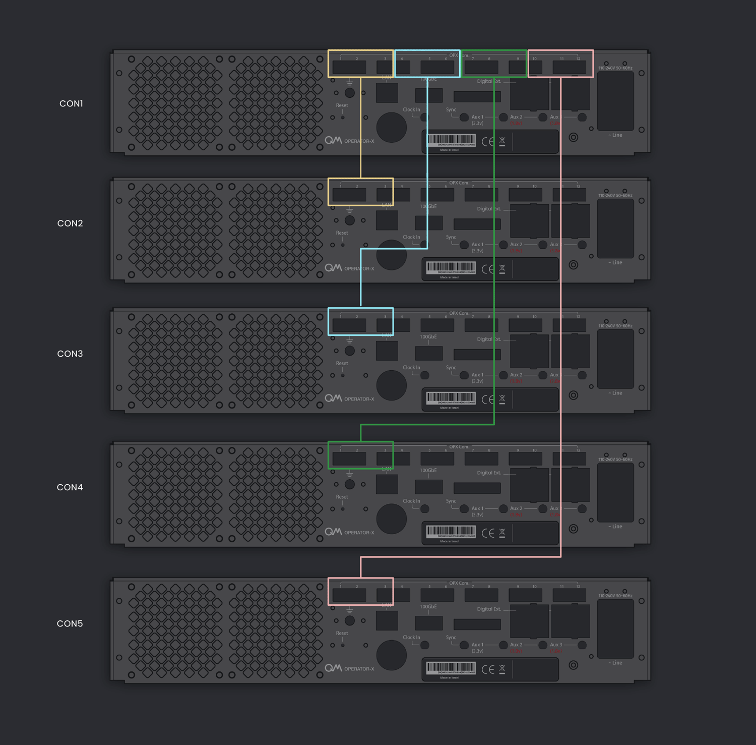 - Use one OPT as a main OPT, connecting all other OPTs' Clk In to the main OPT clock outputs.