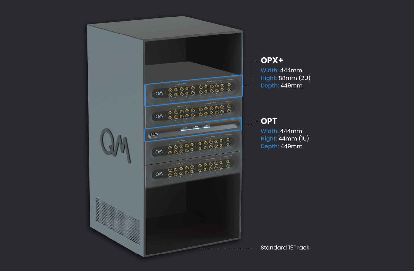 The system fits a standard 19" rack. The sizes of the controllers are shown in the image below. The controllers can be mounted to the rack with the supplied adaptors or stacked on a shelf. The router can be rack-mounted at the back of the rack or simply stacked. For a system of more than 2 OPX+ controllers, it is recommended to place the OPT in the center of the stack, such that equal-length cables will reach all controllers.