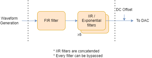 The OPX output filter consists of one FIR filter with a varying length, as will be elaborated later, and one IIR filter with up to two taps. The signal flow is as shown in the image below:
